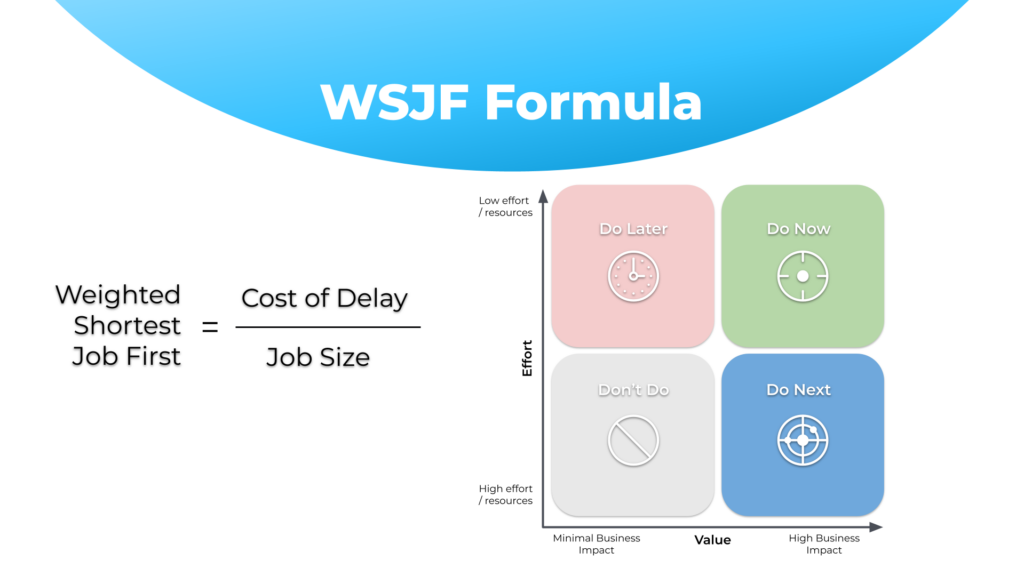Weighted Shortest Job First (WSJF) originates in the Scaled Agile Framework (SAFe) as an economic prioritization method that sequences engineering work by Cost of Delay ÷ Job Size. Generally speaking, the calculation gives preference to jobs with shorter duration relative to the highest impact on the business.